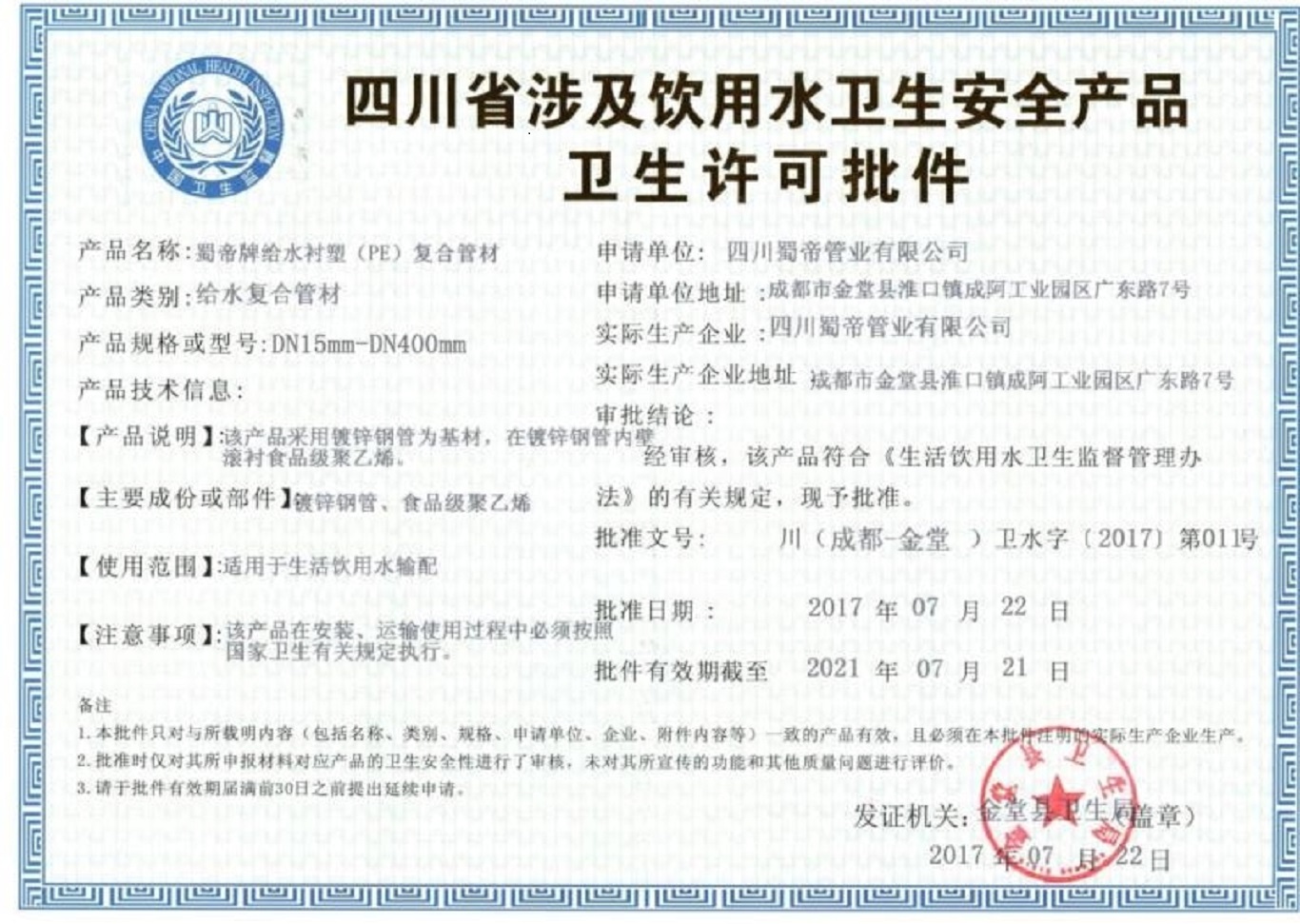 涂塑鋼管衛生許可批件